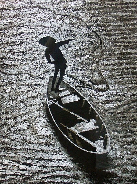 die Schalen von Enteneiern für Lackarbeiten. Die Schalen werden "plattgedrückt" und als Motiv auf eine Trägerplatte geklebt. Anschließend wird alles mit schwarzem Lack bestrichen, der alle Zwischenräume füllt. Danach wird die Oberfläche in einem langwierigen Verfahren plangeschliffen, bis die Eierschalen nicht mehr vom Lack bedeckt sind. |