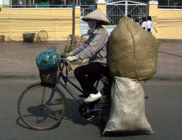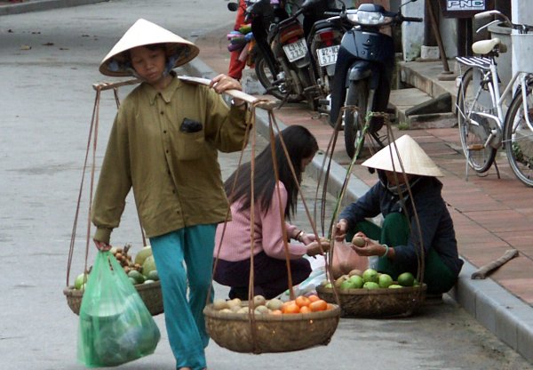 Körbe an Tragestangen. Und das ist in Vietnam noch immer Alltag. Offensichtlich hatt es sich bewährt. |