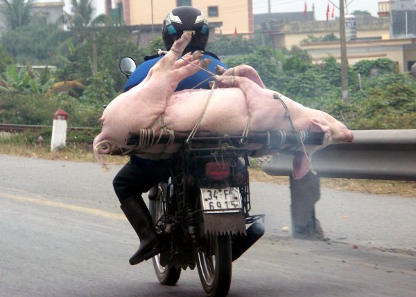 Schweine. Mit einem PKW hätte man da seine Probleme. |