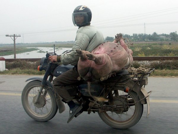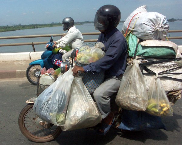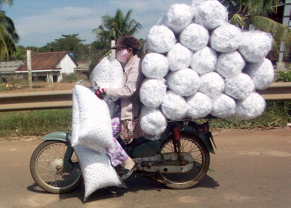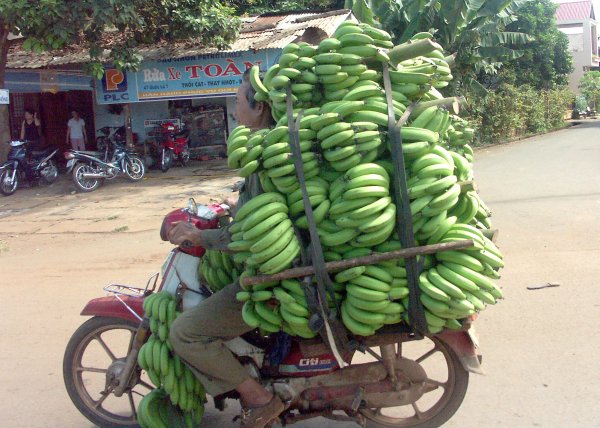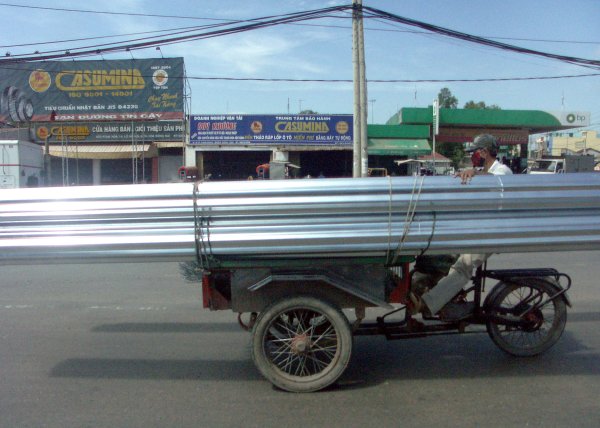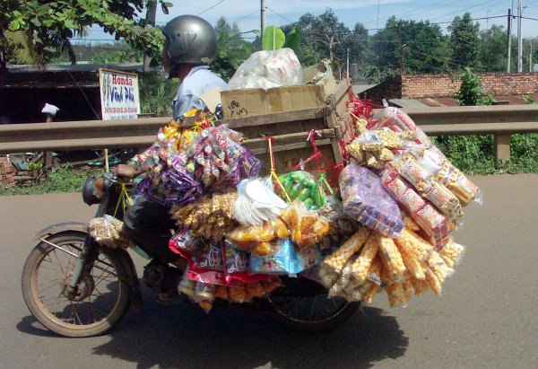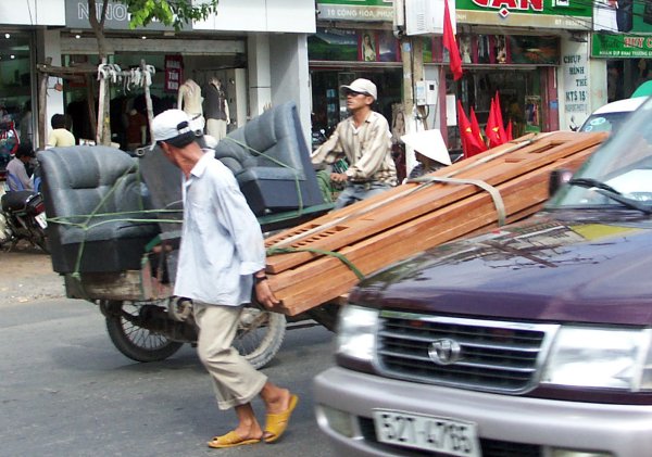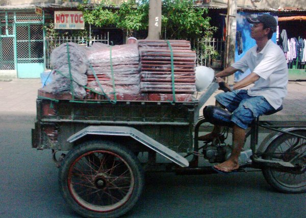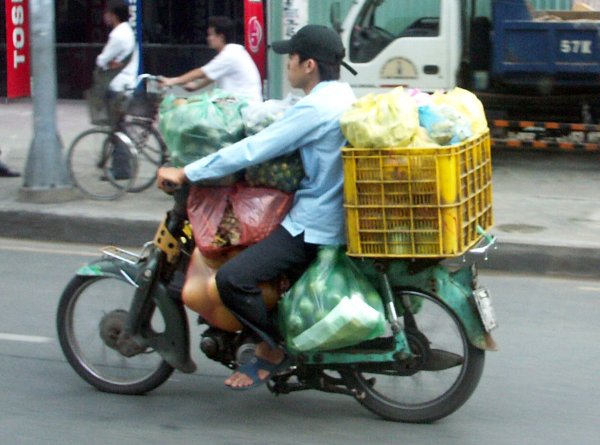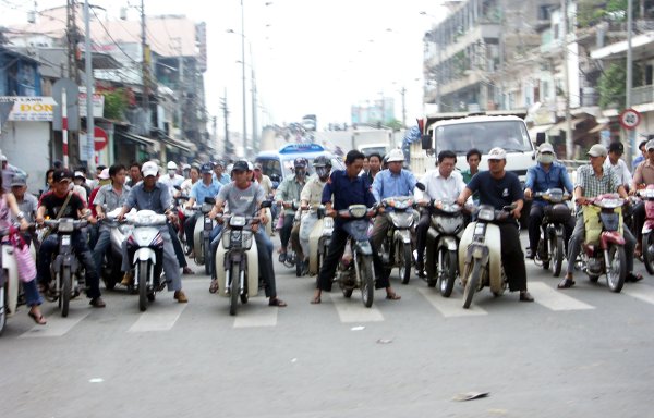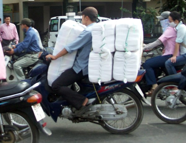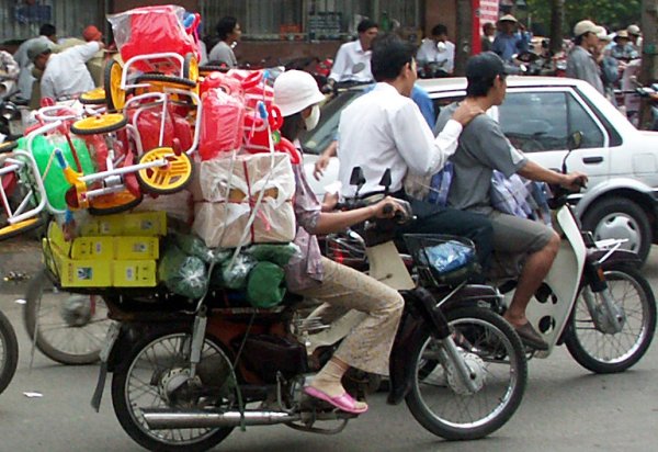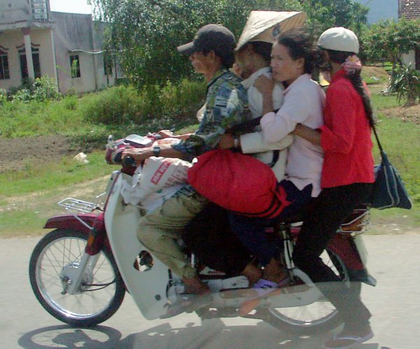 Straße. Man steht immer wieder staunend davor, oder kreuzt mit halb geschlossenen Augen gleichmäßigen Schrittes die Straße, ohne es wirklich begreifen zu können. Offiziell gibt es zwar eine Straßenverkehrsordnung, aber nur auf dem Papier. Weder Rechtsverkehr noch Verkehrsschilder geschweigedenn irgentwelche weißen Striche auf der Straße interessieren den Verkehrsteilnehmer. Gefahren wird dort, wo Platz ist und so wie es gerade passt. Kein Tourist sollte sich hier ein Mietfahrzeug nehmen (es sei denn er kommt aus China). Überlasst das Führen von Fahrzeugen bitte hier den Vietnamesen! |